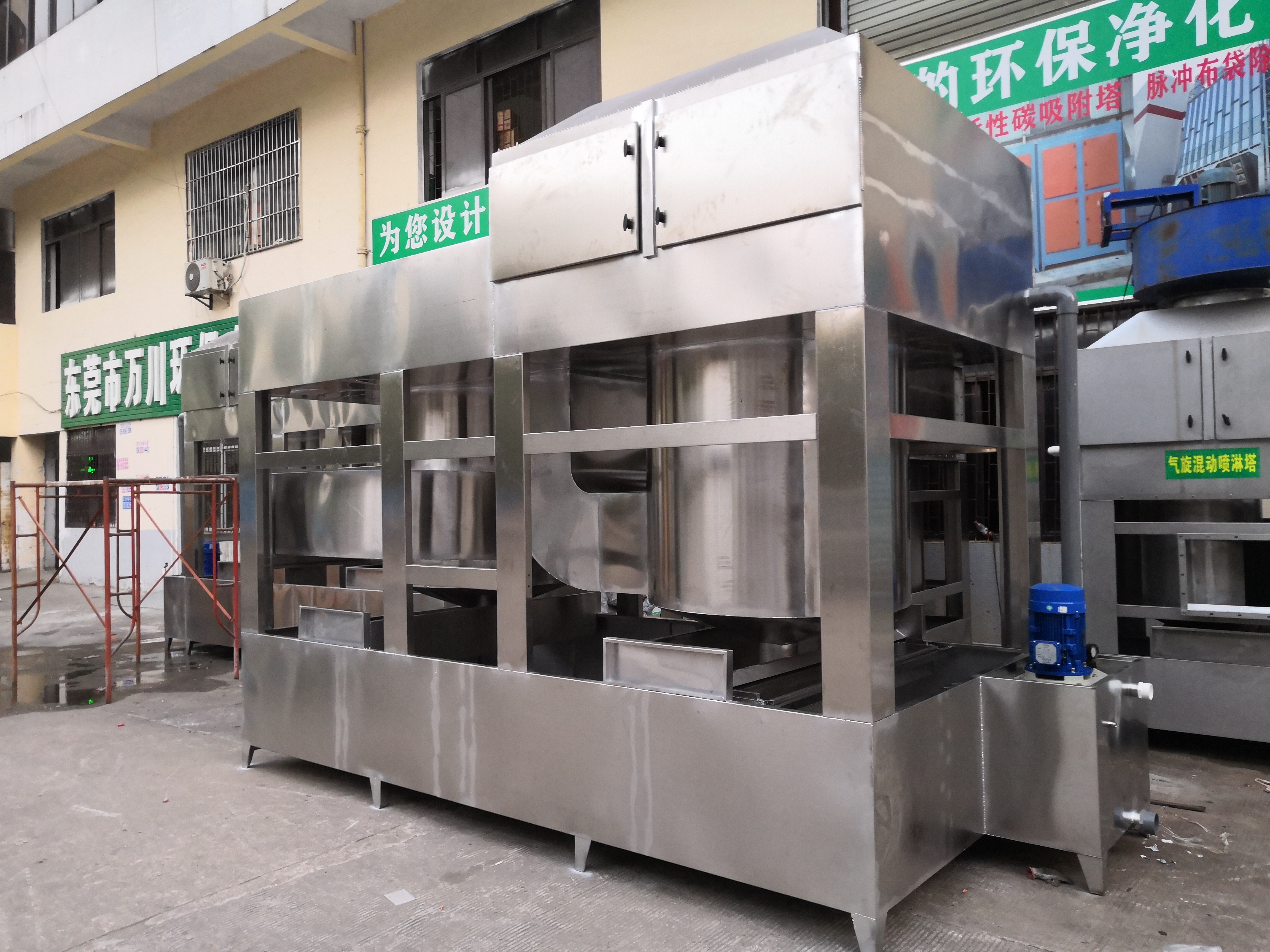 含塵含味氣體通過吸氣罩收集,在風(fēng)機(jī)的作用下,經(jīng)過管道輸送負(fù)壓進(jìn)入雙級(jí)氣旋噴淋塔。氣旋混流裝置快速運(yùn)轉(zhuǎn),多級(jí)連續(xù)的凈化使得含塵含味氣體與水霧充份混合,在離心的作用下達(dá)到氣液分離。氣旋桶內(nèi)部采用水泵循環(huán)給水,水在水箱經(jīng)水泵增壓后自螺旋噴嘴霧化而出,最后回流至水箱循環(huán)使用。分離出來的雜物下沉到水箱底部,經(jīng)凈化后的氣體進(jìn)入填料隔水層,然后由風(fēng)機(jī)排出。