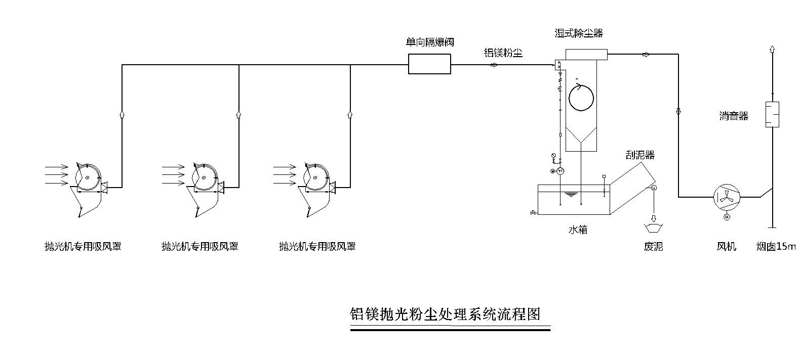 在原有的拋光機(jī)上設(shè)計專用的吸風(fēng)罩,吸風(fēng)罩有效捕集鋁鎂粉塵收集效率達(dá)到95%以上,粉塵通過管道輸送到濕式除塵器,再經(jīng)過濕式除塵器,粉塵顆粒物與水充分接觸,去除其中大部分顆粒污染物,去除效率高于95%,處理后的氣體可以通過室外煙囪直接排放到大氣中。
