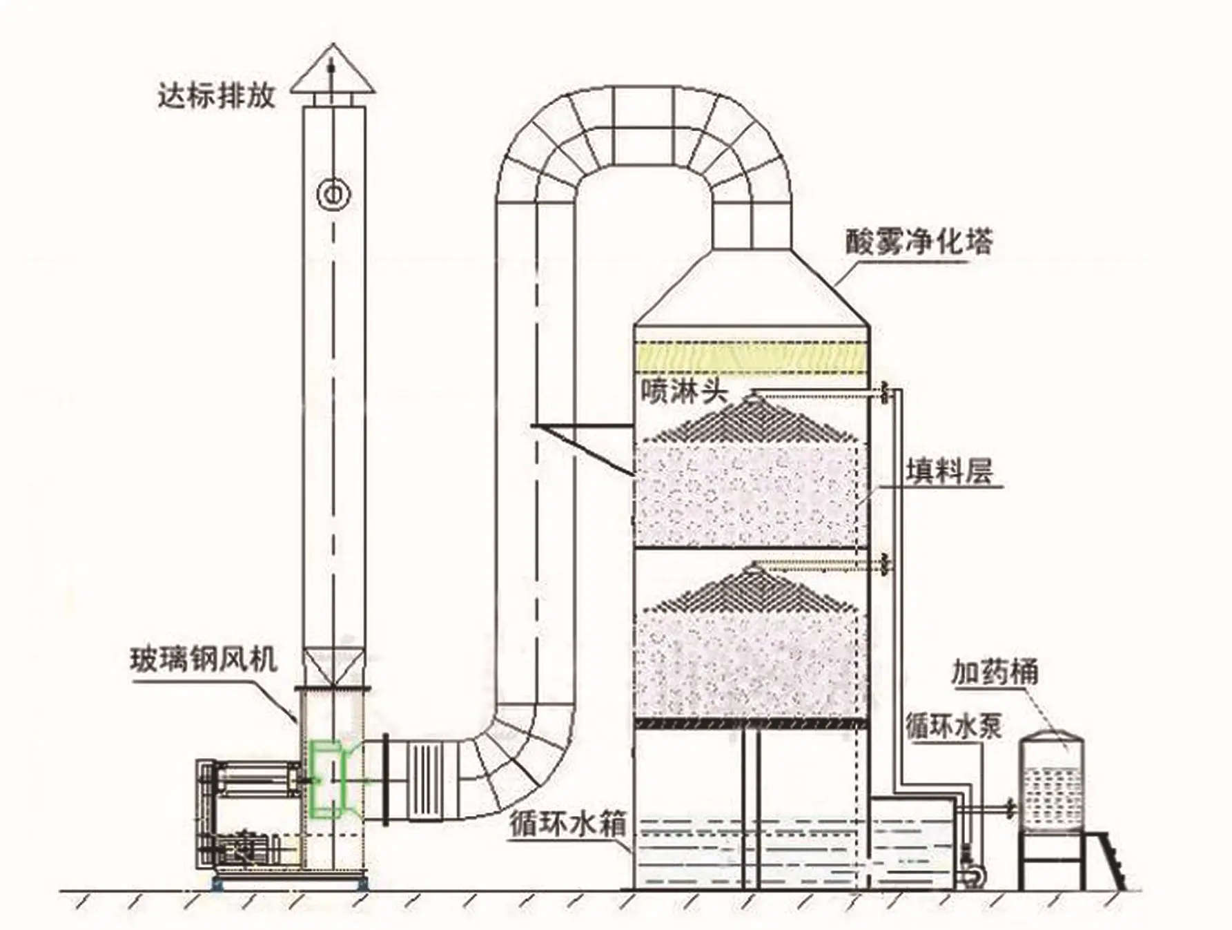 噴淋塔為實(shí)施噴淋法治理廢氣或回收原料的重要組成設(shè)備,故又稱為水洗塔、洗滌塔、凈化塔。根據(jù)廢氣類別及噴淋液的不同可分為水噴淋塔、酸噴淋塔、堿噴淋塔、油噴淋塔、水膜除塵/濕式除塵器;按形狀也可分為立式洗滌塔、臥式洗滌塔;按材質(zhì)又為分PP洗滌塔、玻璃鋼洗滌塔等。 噴淋塔運(yùn)行方式是不斷將酸霧廢氣由風(fēng)管引入凈化塔,將廢氣與氫氧化鈉吸收液進(jìn)行充分接觸吸收中和反應(yīng),酸霧廢氣經(jīng)過(guò)凈化后,再經(jīng)除霧板脫水除霧后由風(fēng)機(jī)排入大氣。吸收液在塔底經(jīng)水泵增壓后在塔頂噴淋而下,之后回流至塔底水箱內(nèi)如此進(jìn)行循環(huán)使用。凈化后的酸霧廢氣可以達(dá)到地方排放標(biāo)準(zhǔn)的排放要求,也會(huì)低于國(guó)家排放標(biāo)準(zhǔn)。