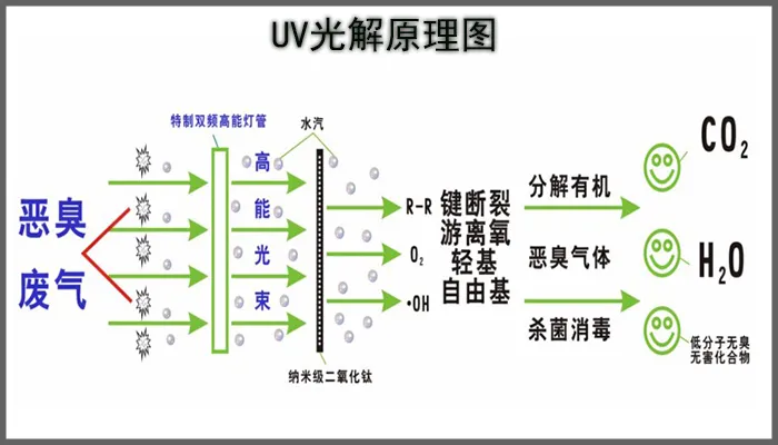 uv光氧催化處理設備是利用185nm波段的紫外線光束分解空氣中的氧分子產生游離氧,即活性氧,因游離氧所攜正負電了不平衡所以需與氧分子結合進而產生臭氧。UV+02-0-+0* (活性氧)0+02 -03( 臭氧),臭氧對有機物具有強的氧化作用,對工業廢氣及其它小分子物有立華見影的清除效果。工業有機廢氣利用排風設備輸入到本凈化設備后,凈化設備運用253.7nm波段的紫外錢光東及185nm波段的紫外線光東產生臭氧對工業廢氣進行裂解后氧化,使工業廢氣物質其反應轉化成水和二氧化碳,再通過排風管道排出室外。下面小編介紹下關于uv光氧催化處理設備的一些小知識.