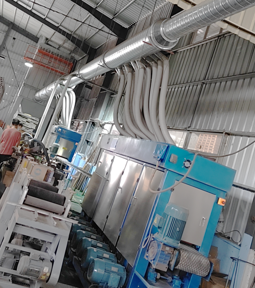 在木塑板生產(chǎn)的過程是要對(duì)其表面砂光、打磨處理,會(huì)產(chǎn)生大量的粉塵,萬川根據(jù)場(chǎng)地與粉塵類型設(shè)計(jì)了除塵方案與一配套木塑脈沖布袋除塵器。